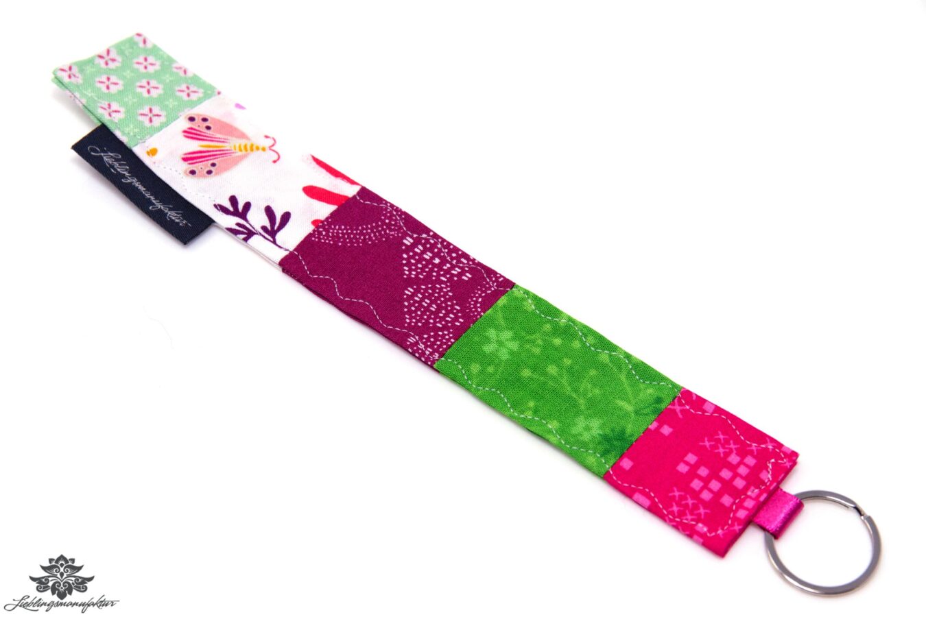 Hochwertiger, robuster Patchwork-Schlüsselanhänger in einmalig buntem Mustermix-Design aus 100% Baumwolle – mit Schlüsselring.