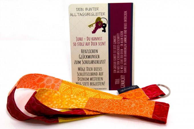 Das Schlüsselband wurde kunterbunt aus zehn verschiedenen hochwertigen Baumwollstoffen (100% Baumwolle), stets in der Farbkombination rot, orange und gelb genäht.