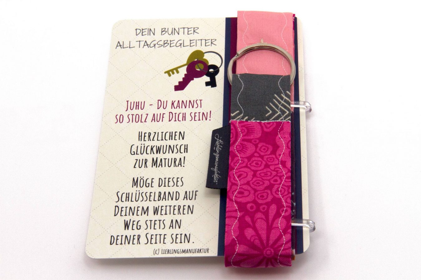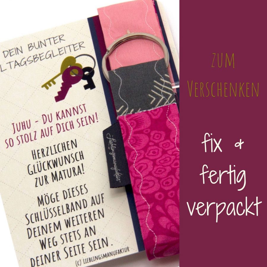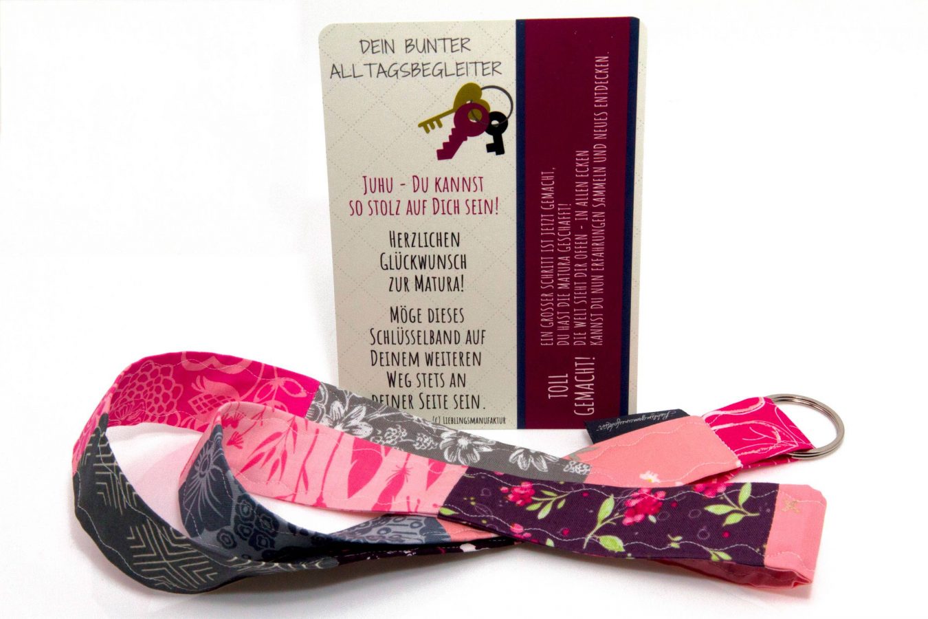 Wir präsentieren Dir ein hochwertiges, stabiles Patchwork-Schlüsselband, liebevoll befestigt auf einem Kärtchen mit herzlichen Wünschen im Postkartenformat. Dieses außergewöhnliche Geschenk ist ein Zeichen der Anerkennung und der Freude zur bestandenen Maturaprüfung.