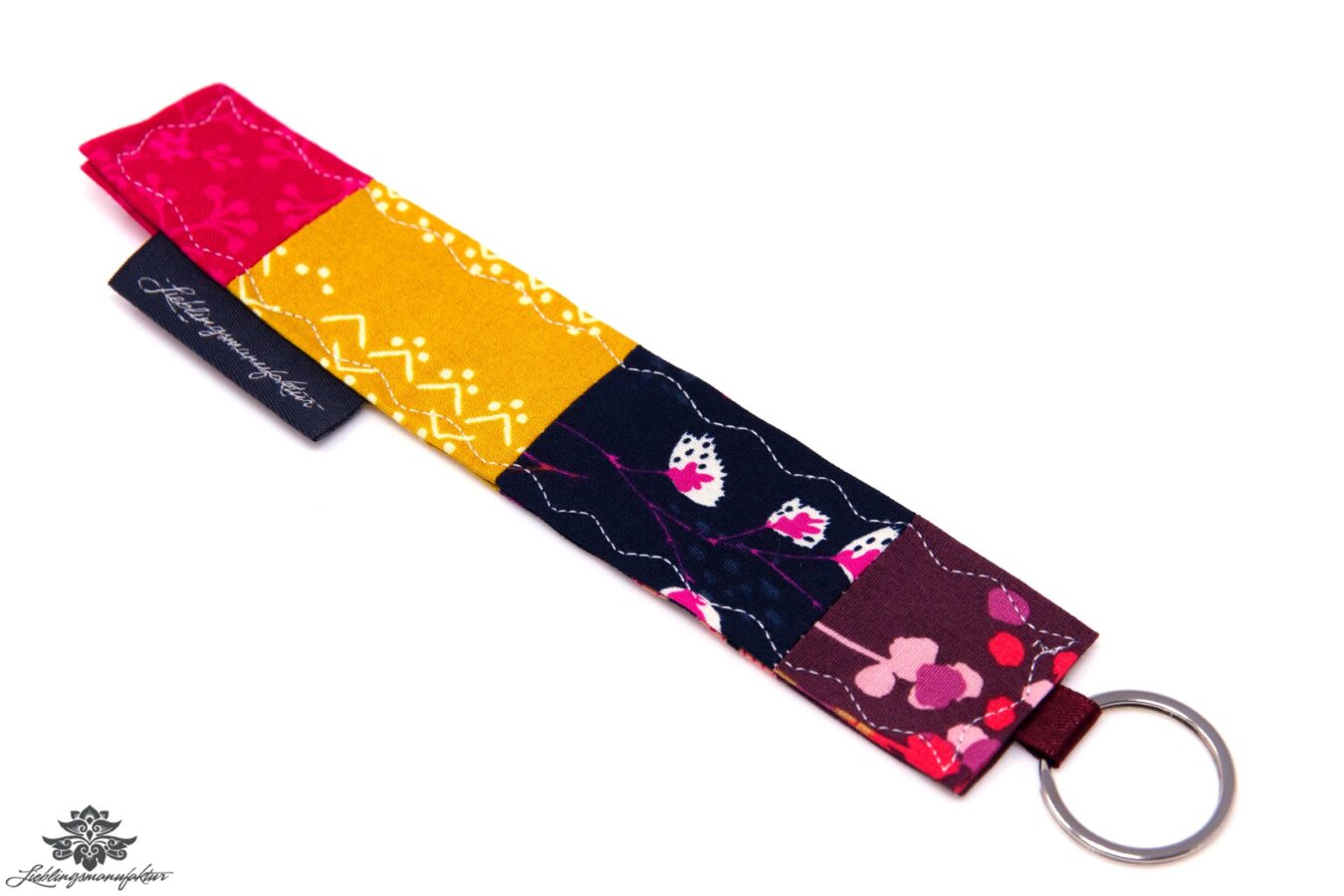 Ein ausgefallener schöner Schlüsselanhänger könnte helfen: Hochwertiger, robuster Patchwork-Schlüsselanhänger in einmalig buntem Mustermix-Design aus 100% Baumwolle – mit Schlüsselring.