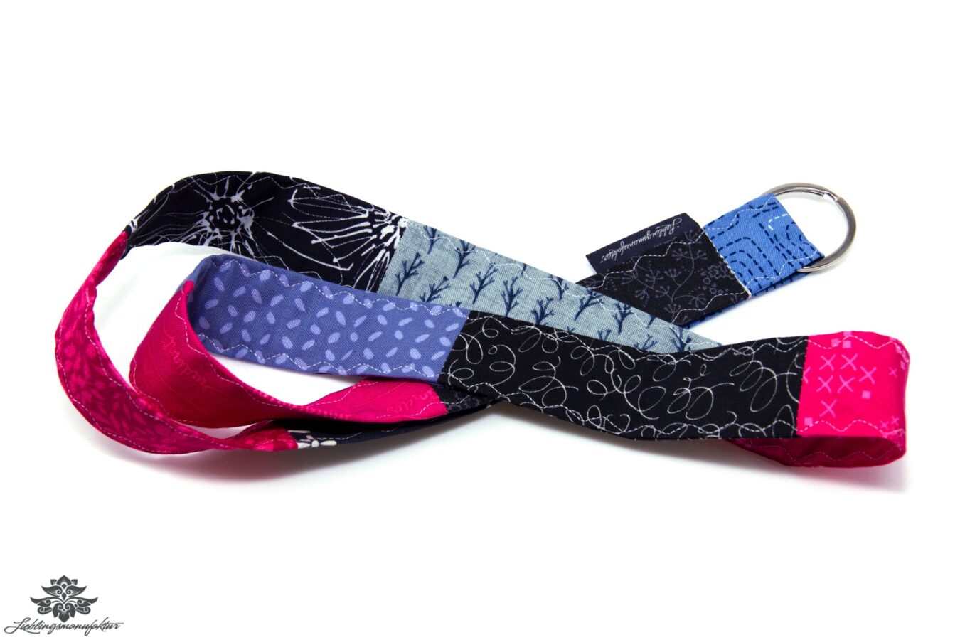 Hochwertiges, robustes Patchwork-Schlüsselband in einmaligem Design aus 100% Baumwolle – mit Schlüsselring.