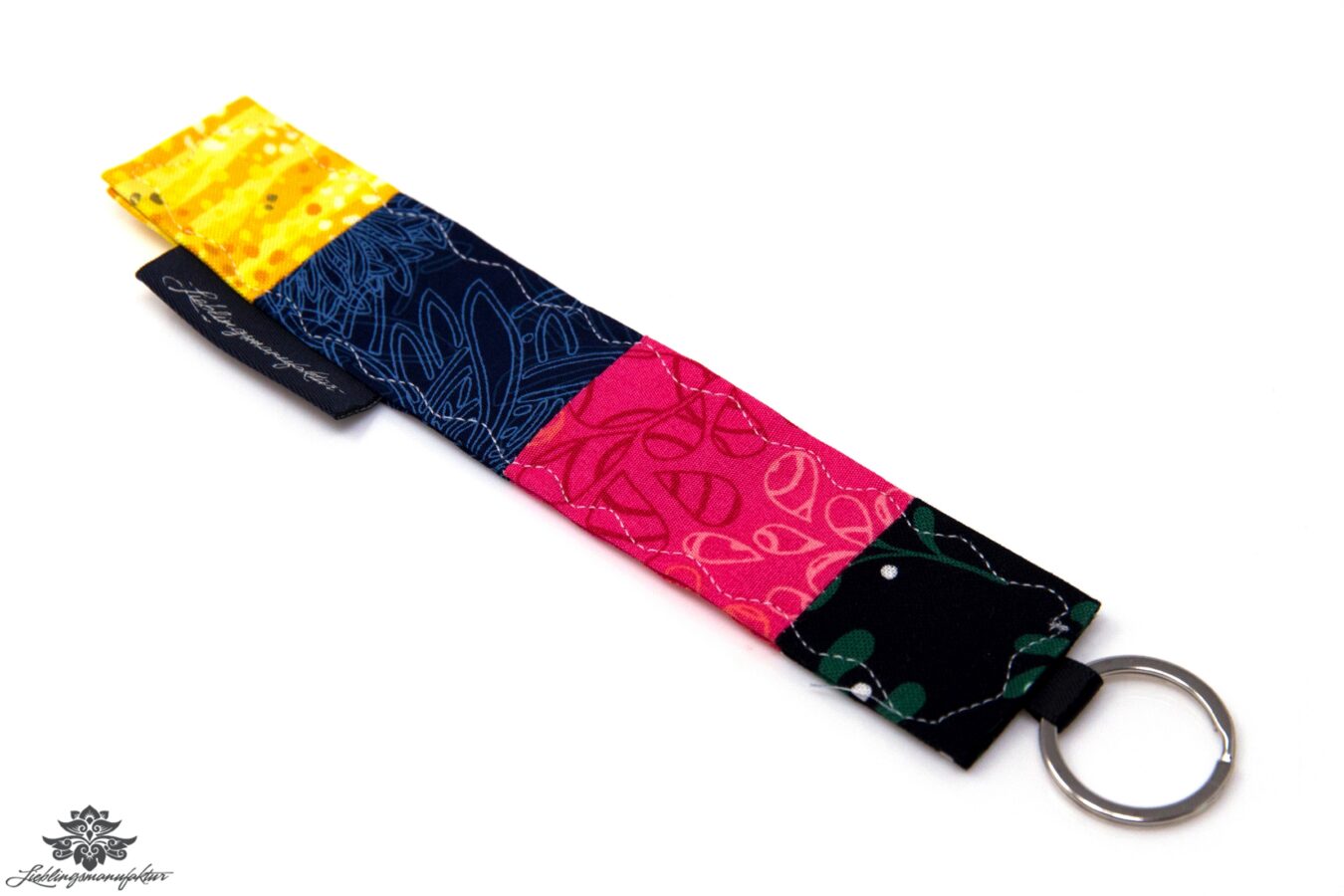 Hochwertiger, robuster Patchwork-Schlüsselanhänger in einmalig buntem Mustermix-Design aus 100% Baumwolle – mit Schlüsselring.