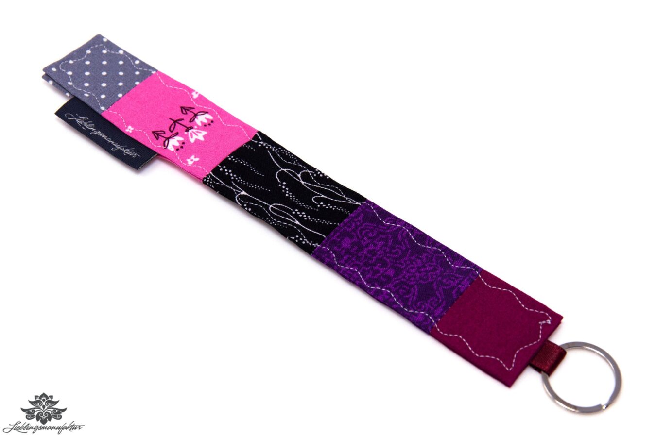 Hochwertiger, robuster Patchwork-Schlüsselanhänger in einmalig buntem Mustermix-Design aus 100% Baumwolle – mit Schlüsselring.