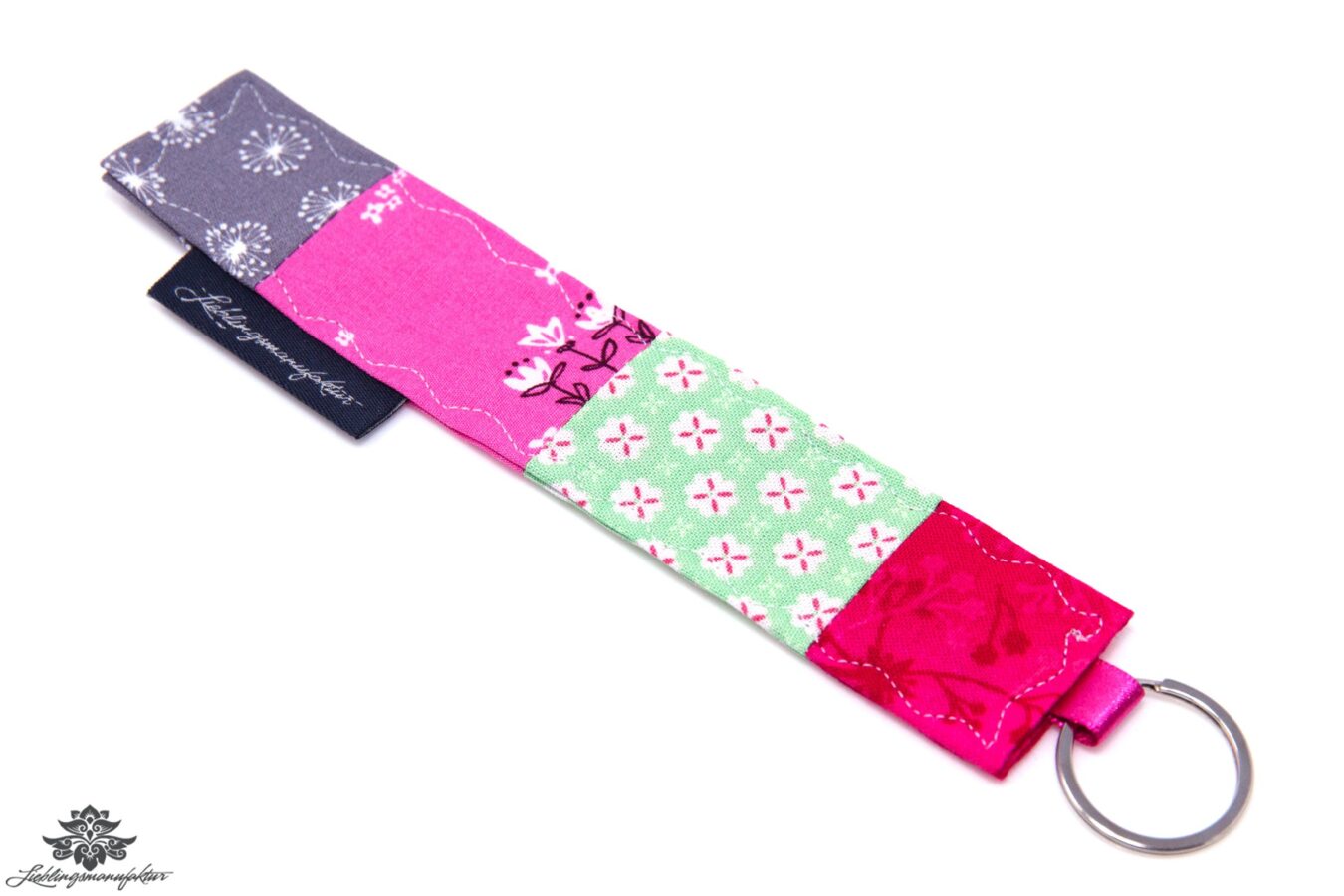 Hochwertiger, robuster Patchwork-Schlüsselanhänger in einmalig buntem Mustermix-Design aus 100% Baumwolle – mit Schlüsselring.