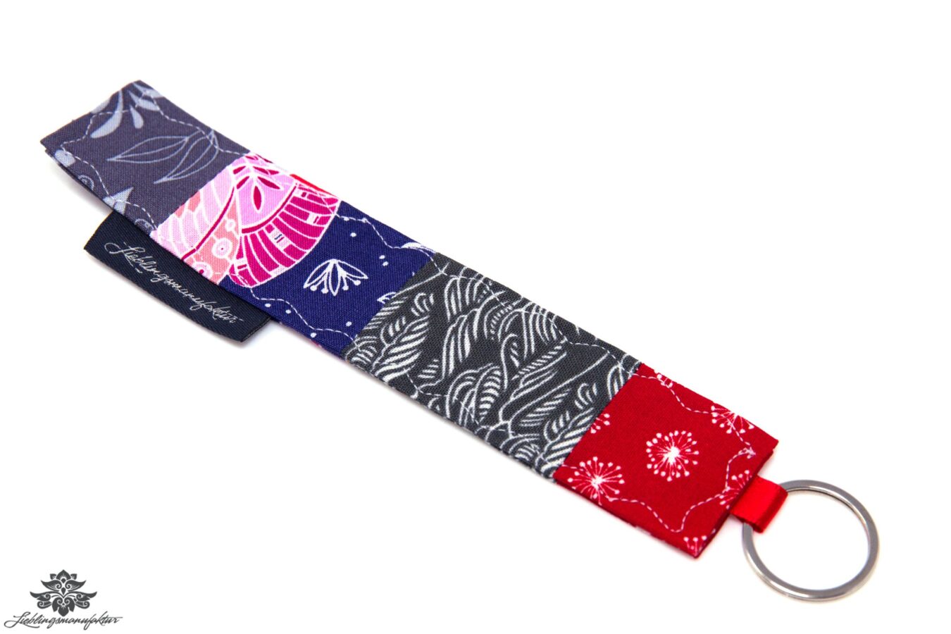 Hochwertiger, robuster Patchwork-Schlüsselanhänger in einmalig buntem Mustermix-Design aus 100% Baumwolle – mit Schlüsselring.