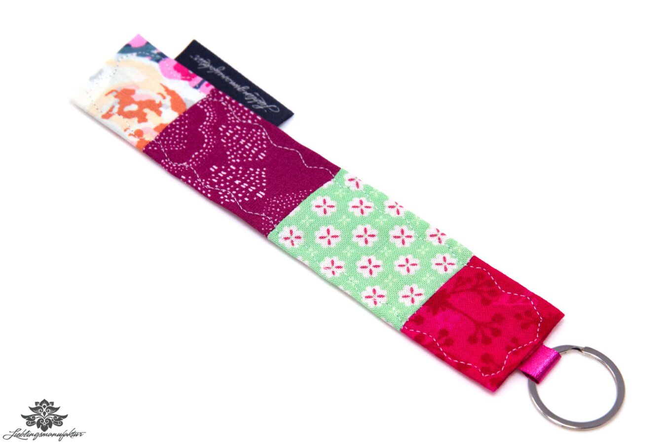 Ein ausgefallener schöner Schlüsselanhänger könnte helfen: Hochwertiger, robuster Patchwork-Schlüsselanhänger in einmalig buntem Mustermix-Design aus 100% Baumwolle – mit Schlüsselring.