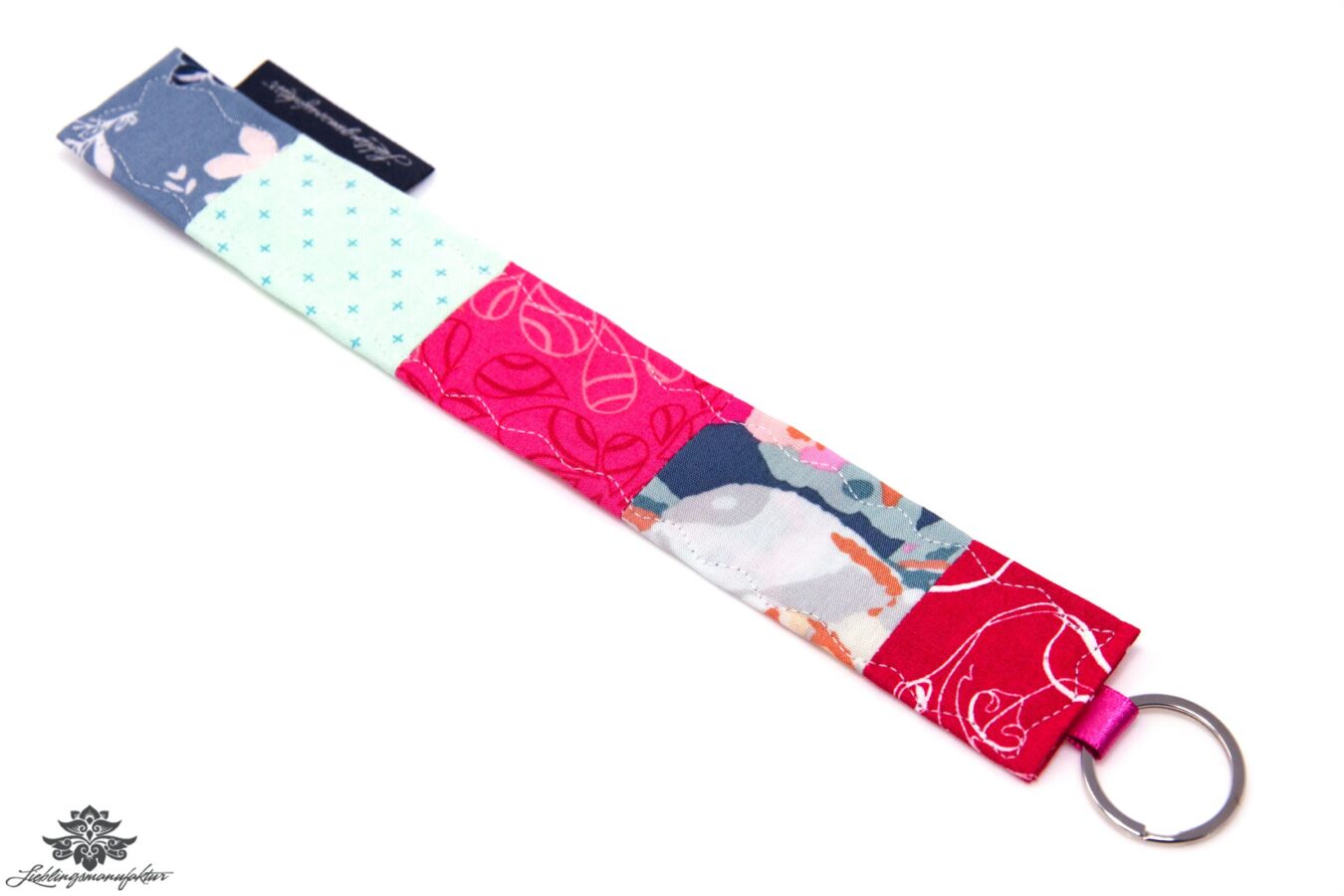 Hochwertiger, robuster Patchwork-Schlüsselanhänger in einmalig buntem Mustermix-Design aus 100% Baumwolle – mit Schlüsselring.