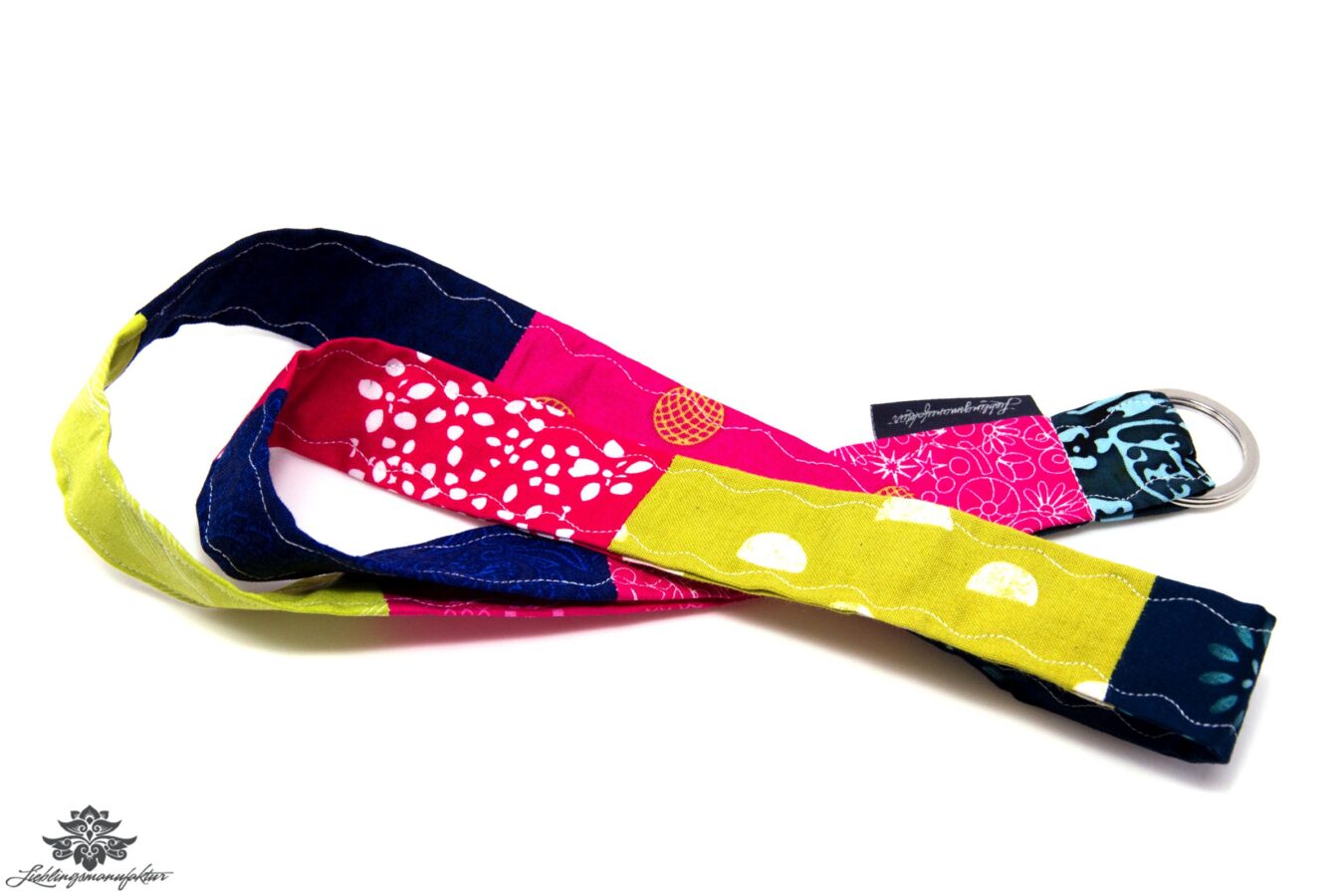 Hochwertiges, robustes Patchwork-Schlüsselband in einmaligem Design aus 100% Baumwolle – mit Schlüsselring.
