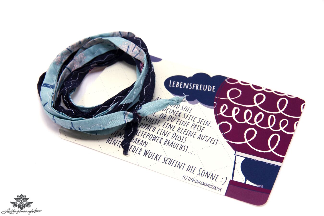 Lebensfrohes buntes Armband – aus zwei verschiedenen Stoffen (100% Baumwolle). Es zaubert ein Lächeln aufs Gesicht und macht manch grauen Tag für einen Moment vergessen. Es erreicht Dich befestigt auf einem Kärtchen mit guten Wünschen im Postkartenformat. So kannst Du es direkt als Geschenk für Deine beste Freundin verwenden.